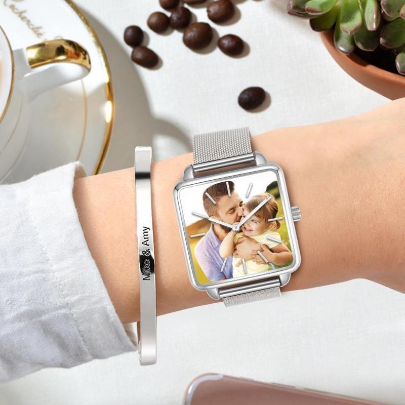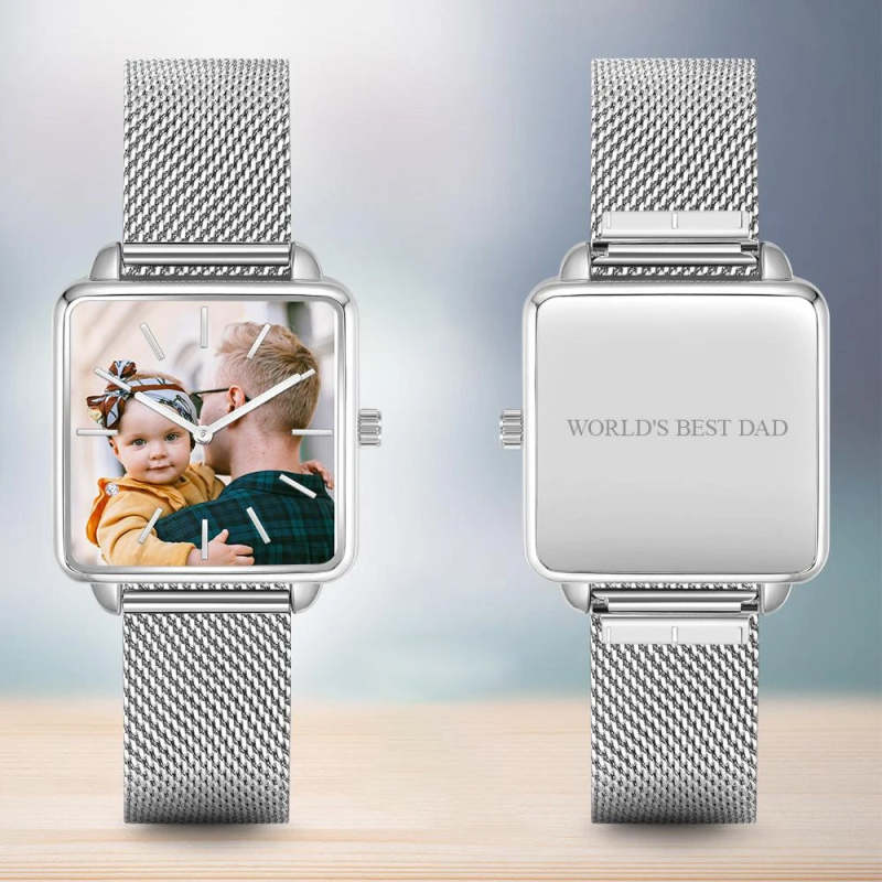 Custom Watch Engraved Photo Watch - Silver Square Case Watch Gifts For Dad