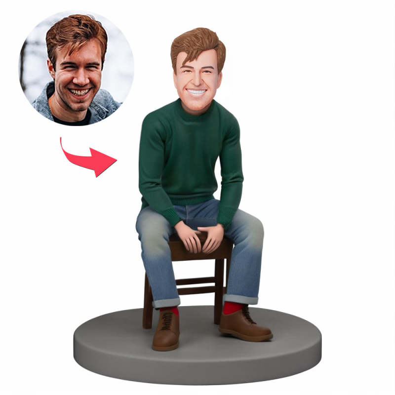 Gift For Him Custom Bobble Head Man Wearing Green Sweater Sitting on Chair
